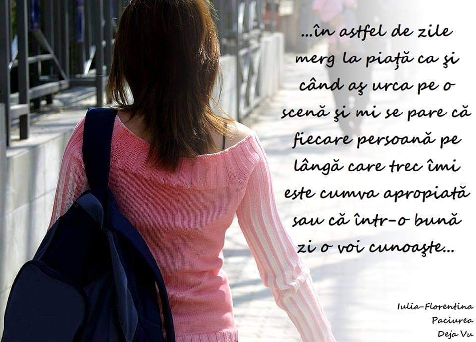 „În unele dimineţi am senzaţia clară că de astăzi ceva se va schimba sau că eu mă voi schimba. Mă uit în oglindă şi ochii ce mă privesc înapoi sunt veseli, energici, au o sclipire ce nu o cunosc, dar care îmi place. Soarele sau ploaia, întreaga zi de afară, vântul, florile de primăvară sau chiar cele de gheaţă îmi par în ziua aceea mai vii, mai colorate, grăitoare, aproape însufleţite. Părul meu, rochia, perdelele, rujul, toate îmi vorbesc şi toate îmi sunt prietene. Este o zi ca oricare alta, dar pe care toată fiinţa mea o percepe diferit… şi în astfel de zile merg la piaţă ca şi când aş urca pe o scenă şi mi se pare că fiecare persoană pe lângă care trec îmi este cumva apropiată sau că într-o bună zi o voi cunoaşte. „