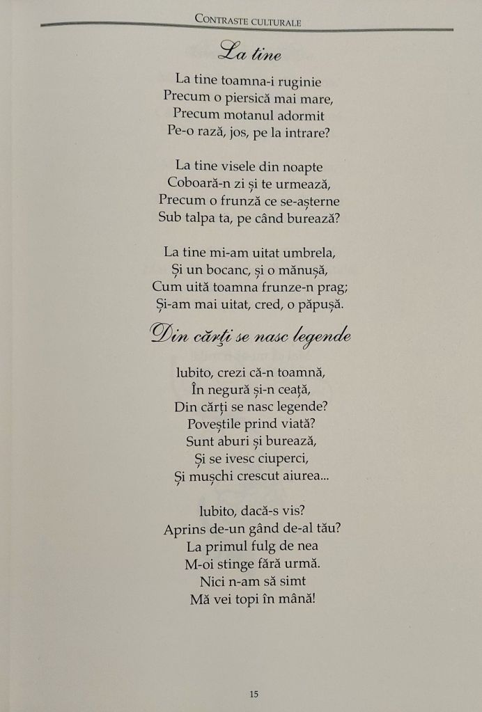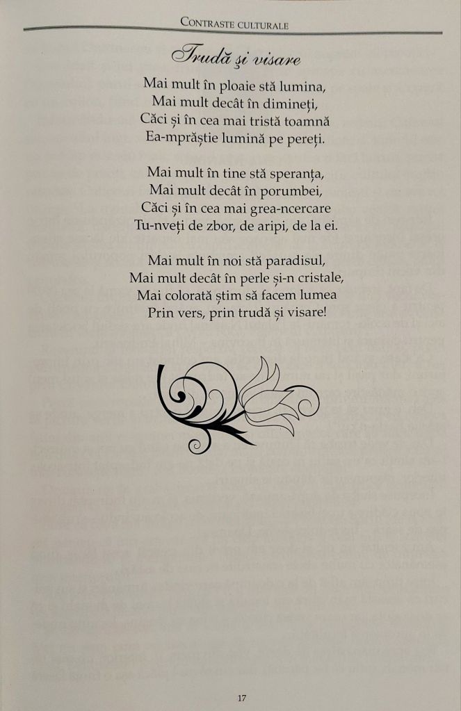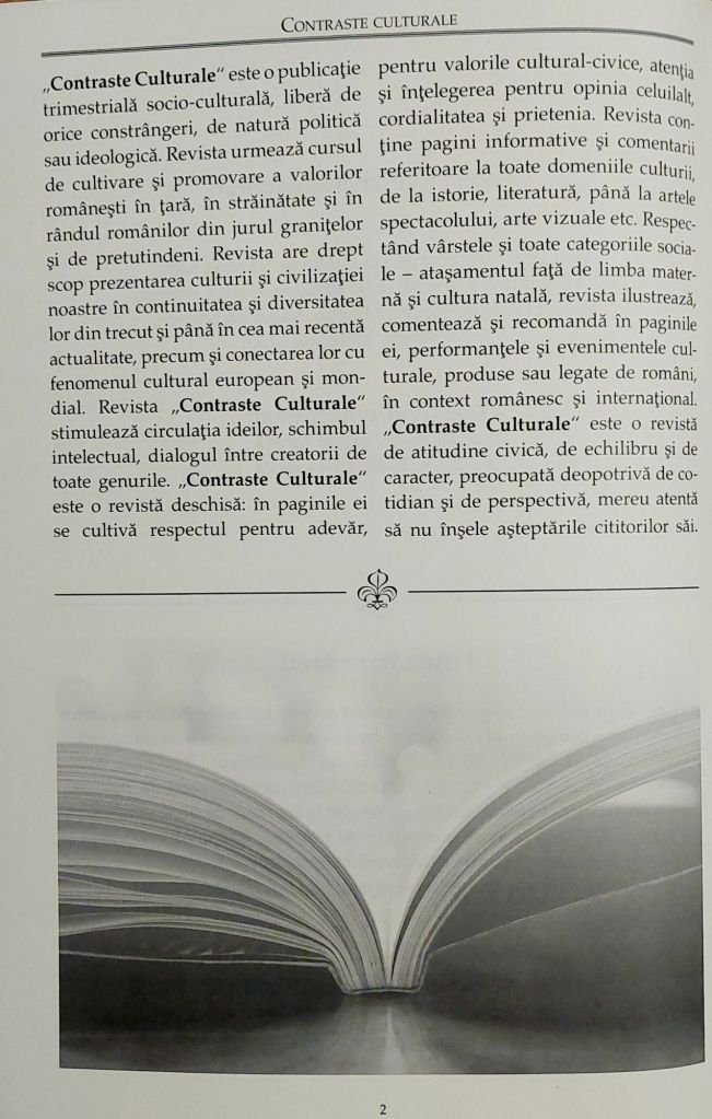 Am bucuria să fiu aproape de voi prin intermediul Revistei „Contraste Culturale”, cu adevărat o publicație „de suflet pentru suflet”.