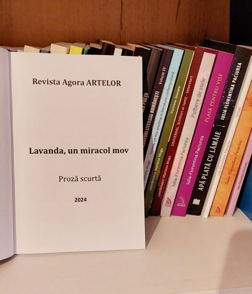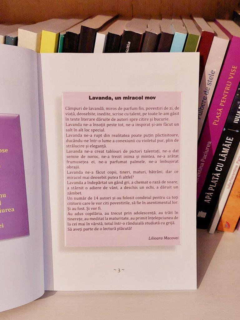 Am primit cu bucurie culegerea de proză scurtă „Lavanda, un miracol mov”, un proiect Revista AGORA ARTELOR. Onorată să mă număr printre autori, am convingerea că cititorii vor afla, între aceste minunate coperte, rânduri pline de viață, de emoție. Vor descoperi povești inedite, ce poartă parfumul incandescent al clipei. Penițele își deapănă cu măiestrie culoarea, împletind istoria anilor ce s-au scurs cu pasiunea visurilor despre viitor. Încap, toate, pe același șevalet, cu ușurința unui zbor violet.