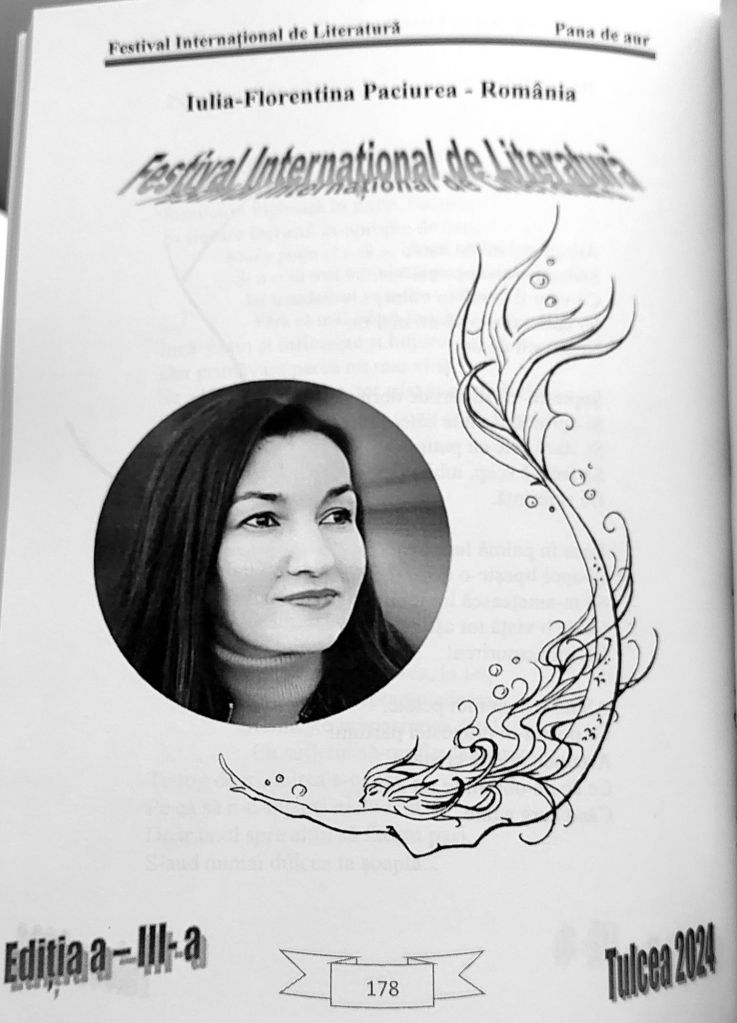 Am bucuria să fiu publicată în „Pana de aur – Antologie Internațională de literatură”, volumul festivalului, apariție ce cuprinde lucrările premiate.
