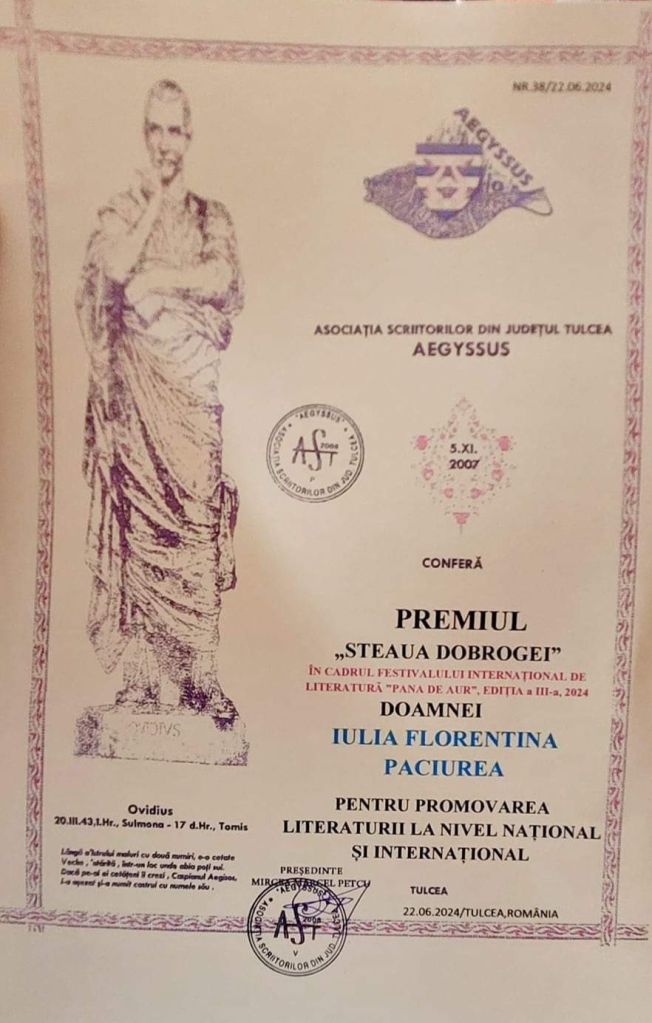 Onorată să primesc Premiul „Steaua Dobrogei” și Premiul „World Poets Association” în cadrul Festivalului Internațional de Literatură „Pana de Aur”, mulțumesc organizatorilor: Trandafir Simpetru, Monica Georgeta Tintea și Petcu Mircea Marcel. Mulțumesc juriului și tuturor celor implicați în făurirea atmosferei incandescente!