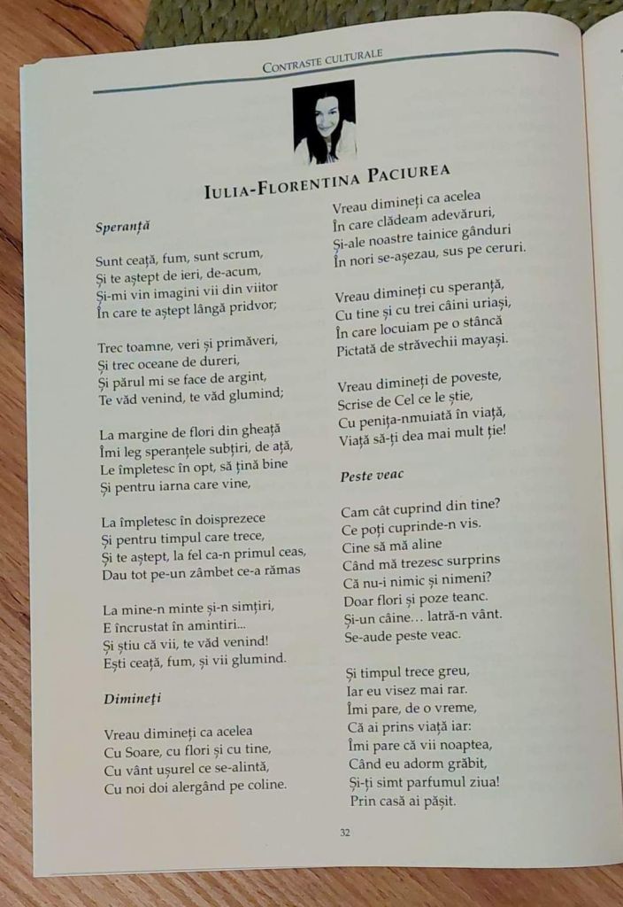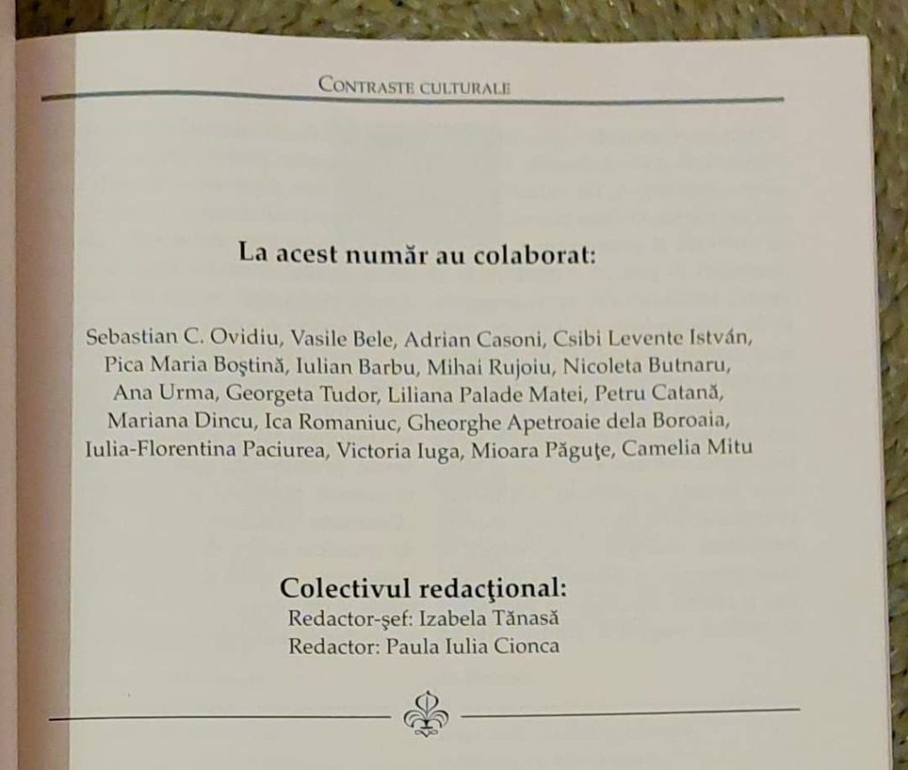 Așa cum v-am obișnuit, mă număr printre autorii Revistei „Contraste Culturale”. Mulțumesc întregului colectiv redacțional pentru inițiativă, dedicare și profesionalism! Felicitări tuturor celor implicați în făurirea acestui proiect de suflet! Vă invit la lectură!