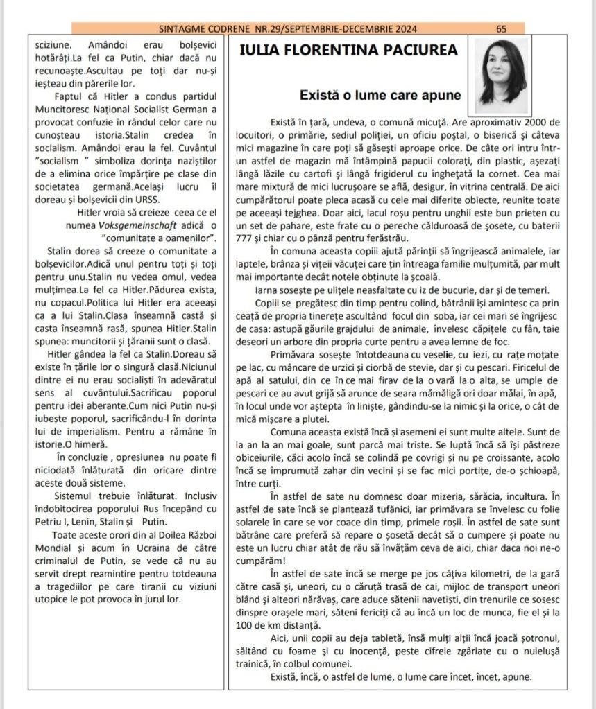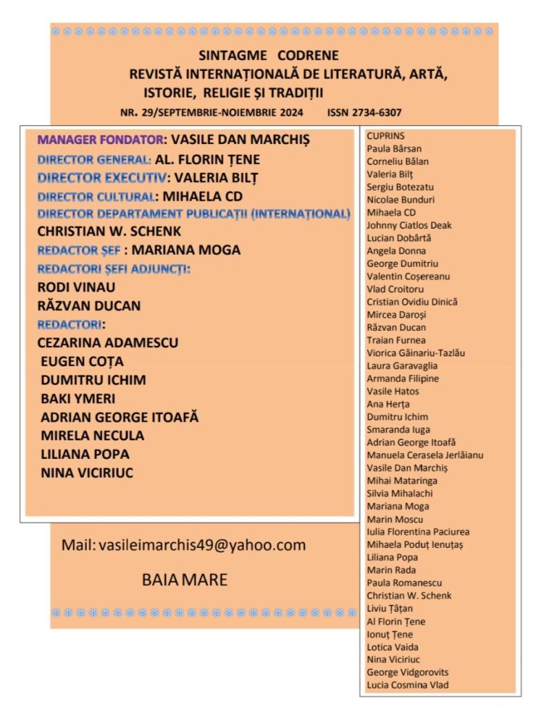Onorată să mă număr printre autori, vă prezint numărul 29/Septembrie – Decembrie 2024 al publicației „Sintagme Codrene”. Vă invit să descoperiți revista internațională de literatură, artă, istorie, religie și tradiții, acest far luminos peste timp, ce îmblânzește clipa și se așează, de fiecare dată, în conștiința noastră colectivă, unind autori și cititori, împletind gând și spirit, trecut și viitor, aducând în prezent umbre și speranțe.
