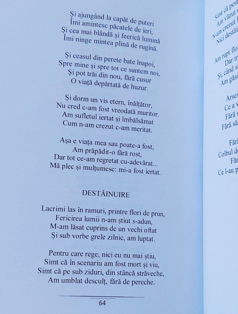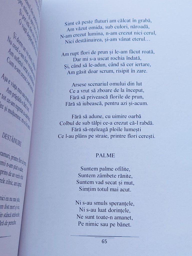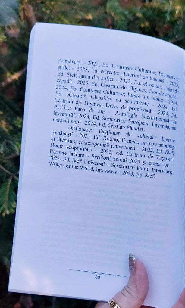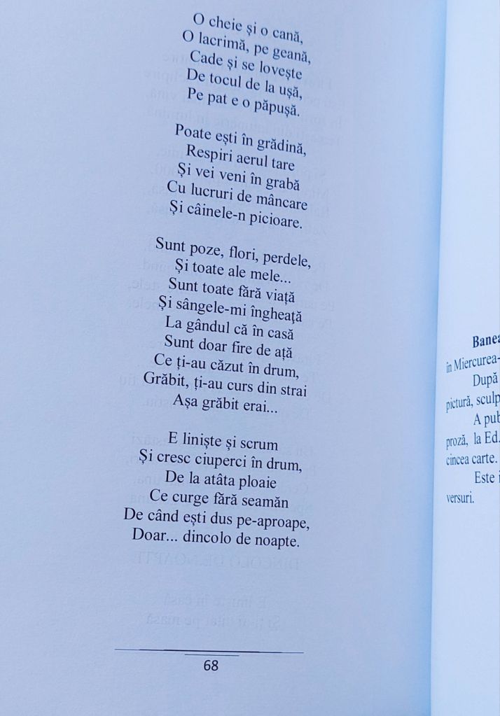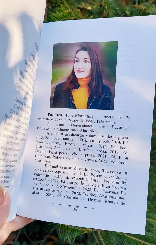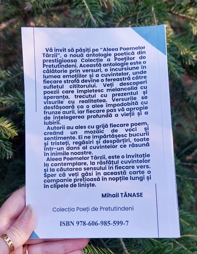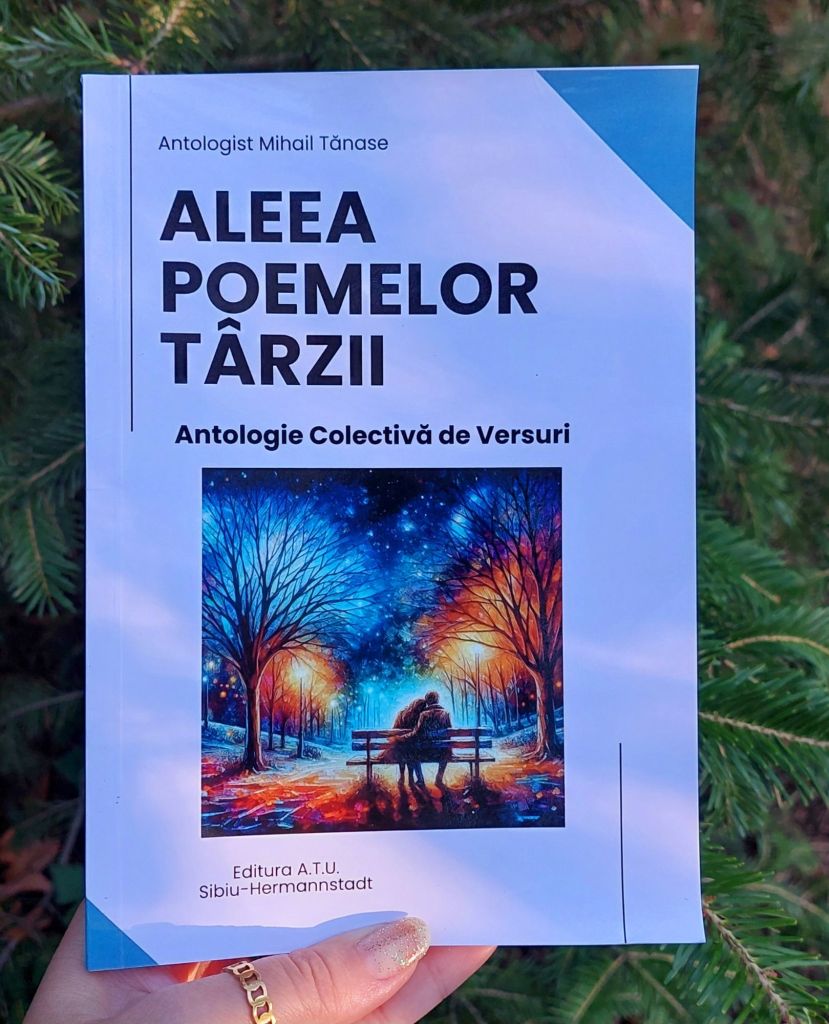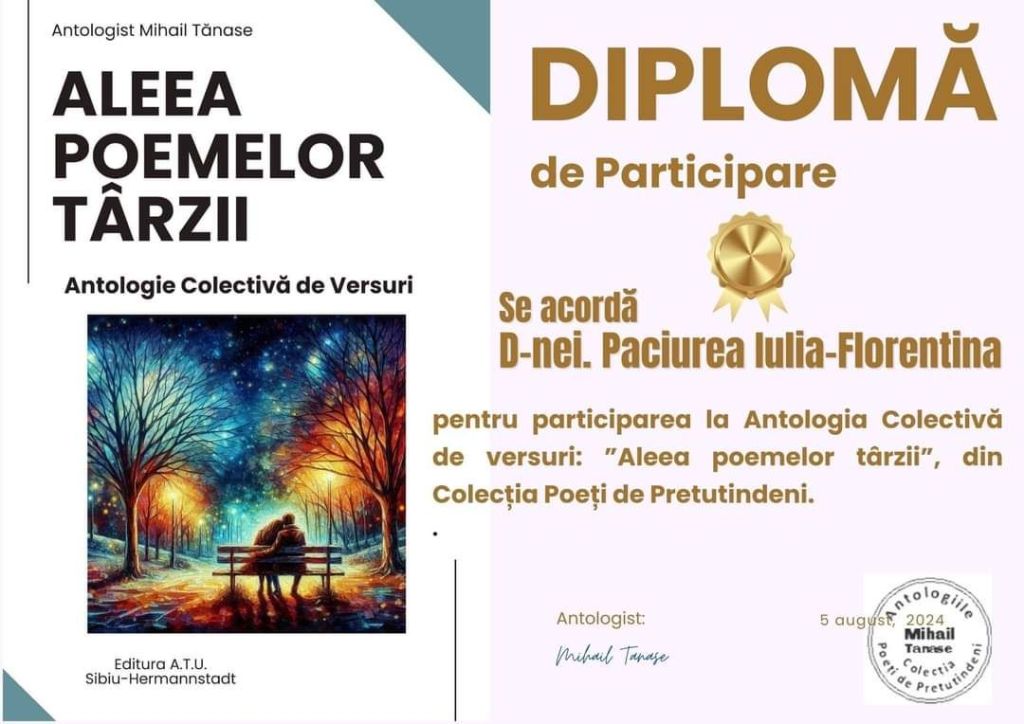 Onorată să mă număr printre autori, vă prezint lucrarea „Aleea poemelor târzii”, antologie ce face parte din colecția „Poeți de Pretutindeni”. Am primit cu bucurie diploma de participare și îi felicit pe toți cei care și-au lăsat amprenta cu dăruire, talent și pasiune în fiecare poem.