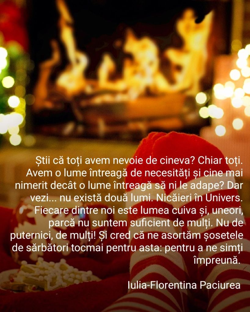 Știi că toți avem nevoie de cineva? Chiar toți. Avem o lume întreagă de necesități și cine mai nimerit decât o lume întreagă să ni le adape? Dar vezi… nu există două lumi. Nicăieri în Univers. Fiecare dintre noi este lumea cuiva și, uneori, parcă nu suntem suficient de mulți. Nu de puternici, de mulți! Și cred că ne asortăm șosetele de sărbători tocmai pentru asta: pentru a ne simți împreună.