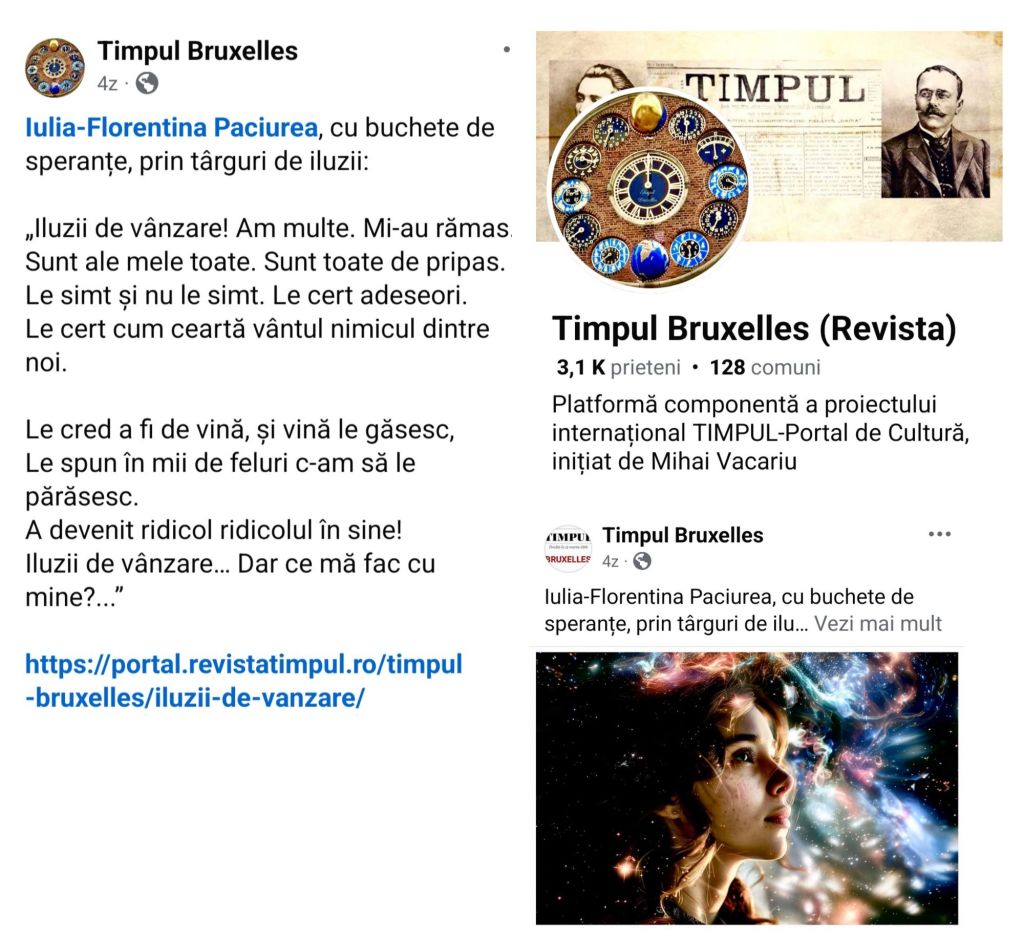 Mulțumesc Revistei „Timpul Bruxelles” pentru aprecierea și publicarea poemului „Iluzii de vânzare”! Sunt onorată.